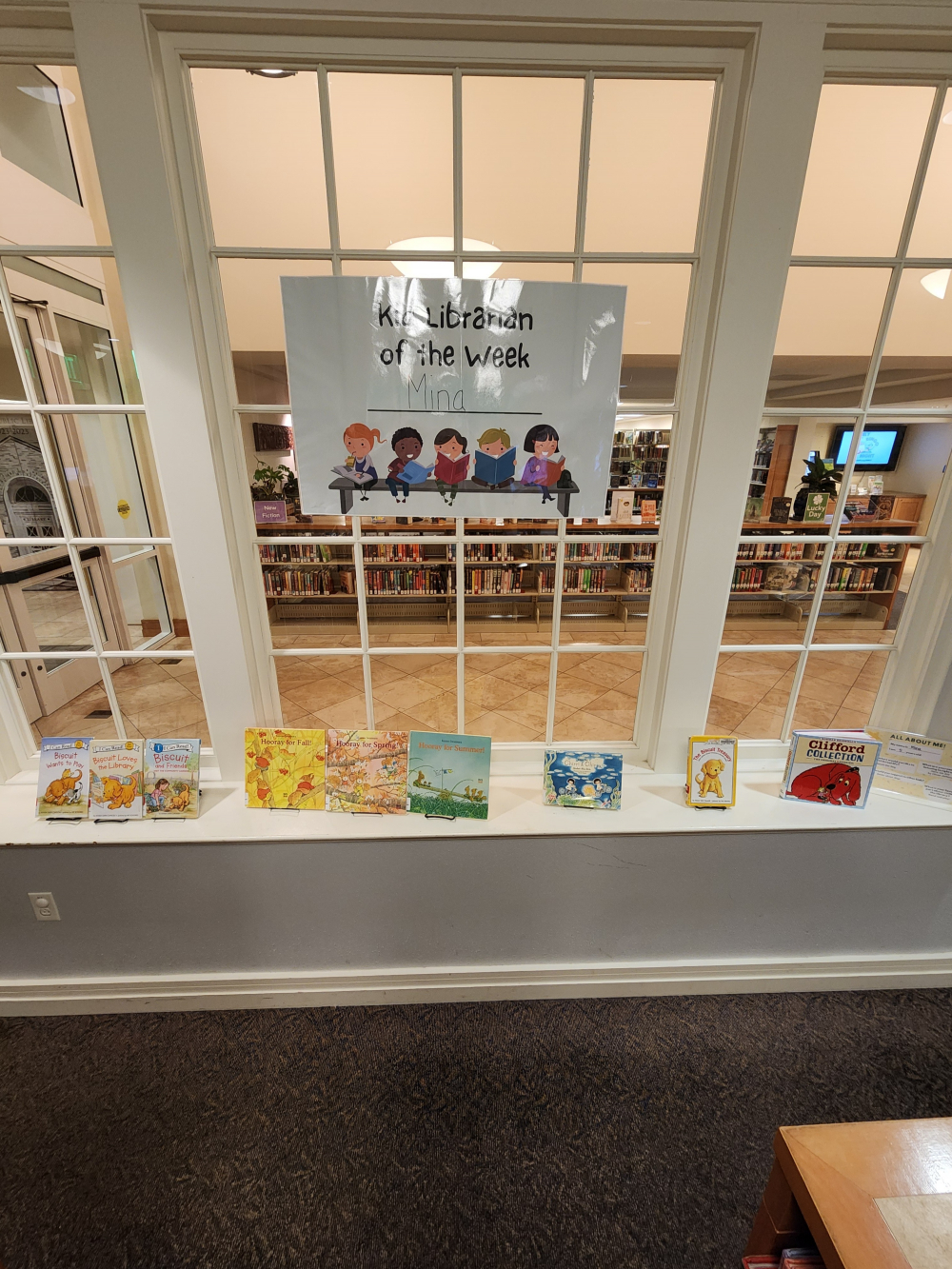 We are back from Thanksgiving break with this week’s Kid Librarian, Mina! Mina (5) loves to read and play at the Library. She recommends dog books to other readers and has included stories about Biscuit and Clifford, everyone’s two favorite pups, on her display.